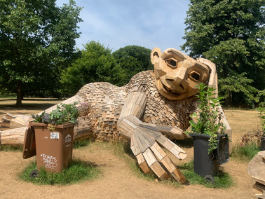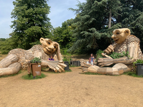 One of the nifty installations at the Kew was of a pair of apparently-vegetarian trolls having a picnic on the lawn. All of the kids were thrilled with this, but especially this was right up Thane's alley; he has been using his tablet throughout the transit times to draw similar kinds of creatures.