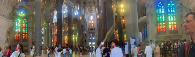 Once I was back in the flat, the boys put pants on (import of this will be apparent soon) and reorganized stuff for our walking outing into Barcelona. Our goal was about a one-hour walk to get to La Sagrada Familia Basilica, via pit stop at Starbucks. Walking through central Barcelona pretty interesting; it’s a fixed grid of same-sized city blocks, completely filled with same-shaped octagonal buildings. Stores and shops at ground level, apartments in upper floors. These city blocks are separated by one way streets, and city sections divided by more major roadways with well-defined lanes for pedestrians, cyclists/scooters, and motorists. Public transit is also very organized, although we didn’t end up using any on this trip. We pushed hard on foot to get to the basilica for our booked entry time.