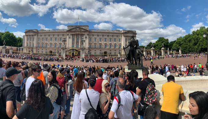 We enjoyed the spectacle, even if we didn't necessarily understand much of it. The senior officers barked out unintelligible orders, which the guards followed crisply, maneuvering together to march, turn, stop, shift the position of their hands and guns. Each guard was inspected to make sure their uniform was in top condition. We were fascinated by their tall hats, fixed in place by straps positioned between the lower lip and chin - not an obviously comfortable position, in our view. We Googled that these hats are made of skins from Canadian black bears (responsibly sourced, apparently); each hat is valued at about £650 and can last for up to 80 years!